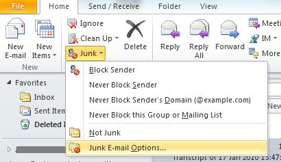 - From the 'Home' tab, click the 'Junk' drop down box, then choose Junk Email Options.